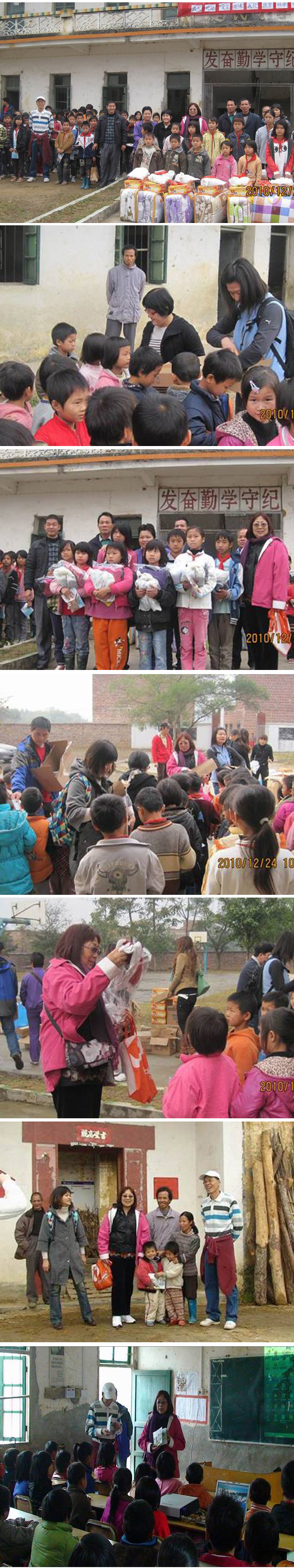 2010年12月24日爱心协会的成员携同优生蔡经理、泽远公司袁总夫妇、业务人员等慰问石潭镇建民小学,为学生们欢度圣诞。