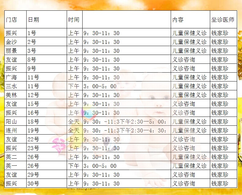 10月份爱婴坊各区域及门店义诊安排
