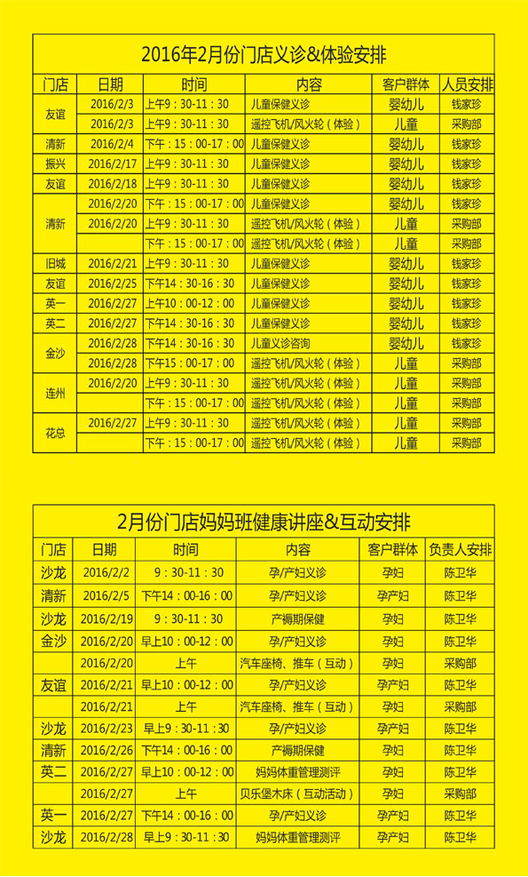 2016年2月份各门店“义诊&体验”及“妈妈班健康讲座&互动”时间安排表