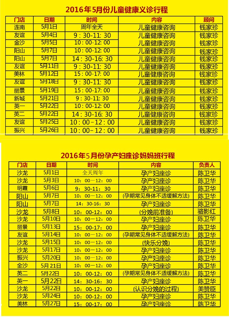 2016年5月份各门店“义诊&妈妈班健康讲座”时间安排表