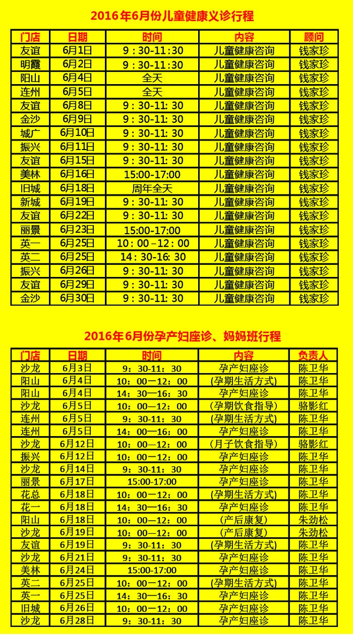 2016年6月份各门店“儿童孕妇义诊&妈妈班健康讲座”时间安排表