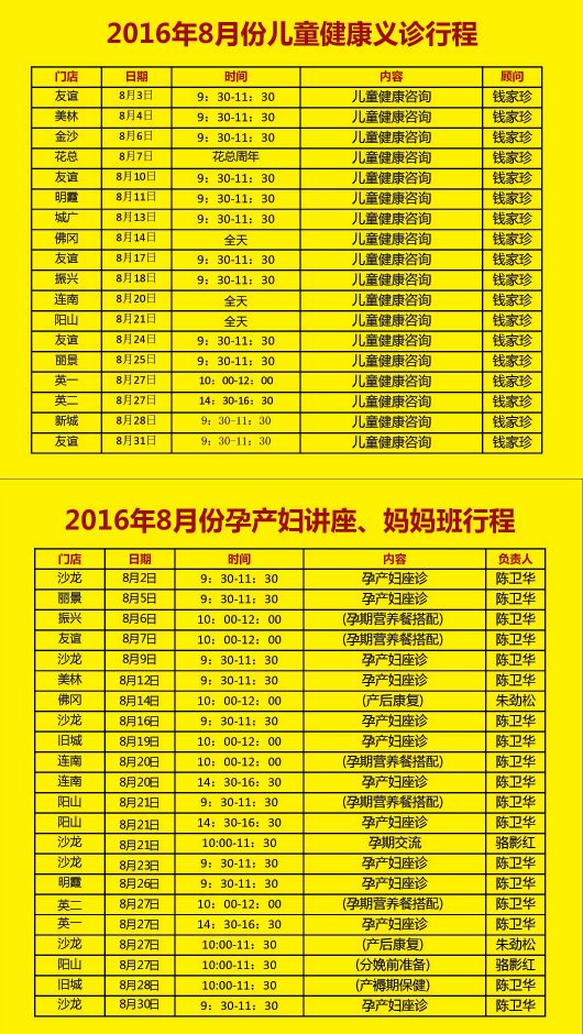 八月份“妈妈班健康讲座”及“各门店义诊”时间安排表