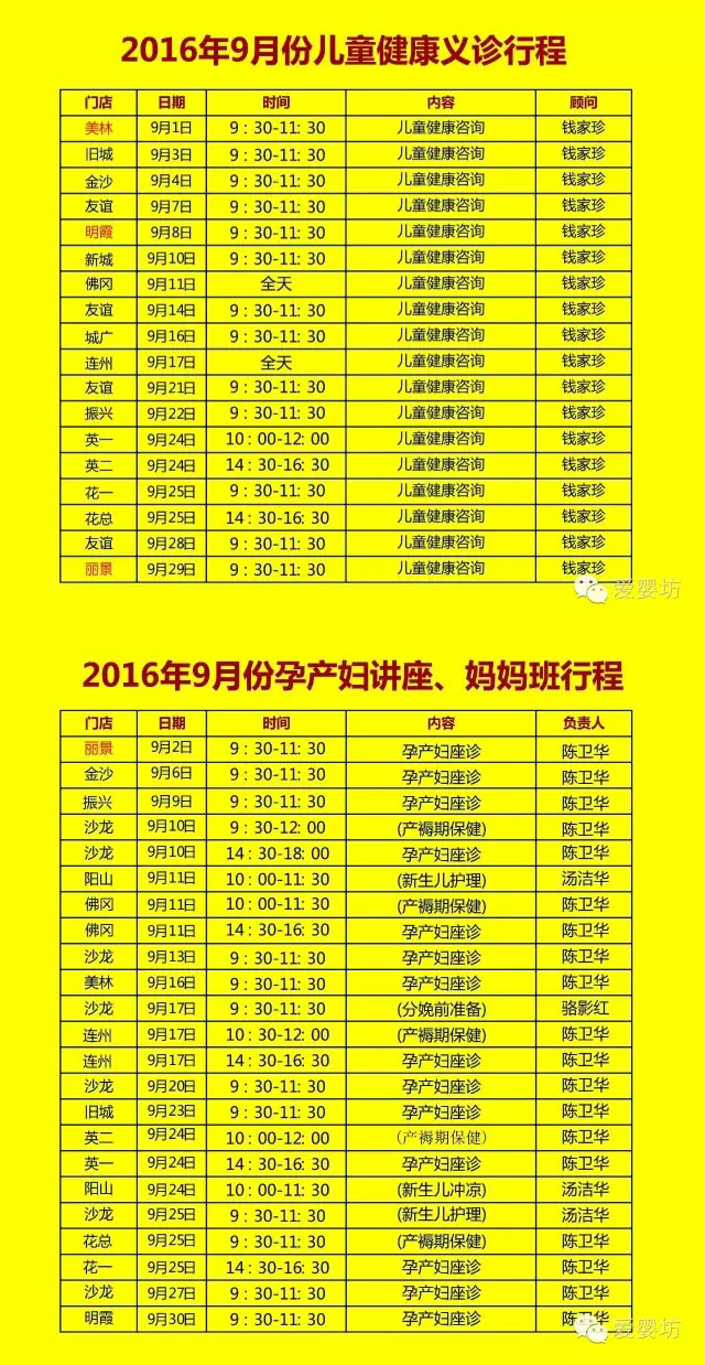 九月份“各门店儿童义诊&妈妈班健康讲座”时间安排表