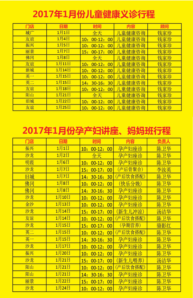 2017年1月份“各门店儿童义诊&妈妈班健康讲座”时间安排表