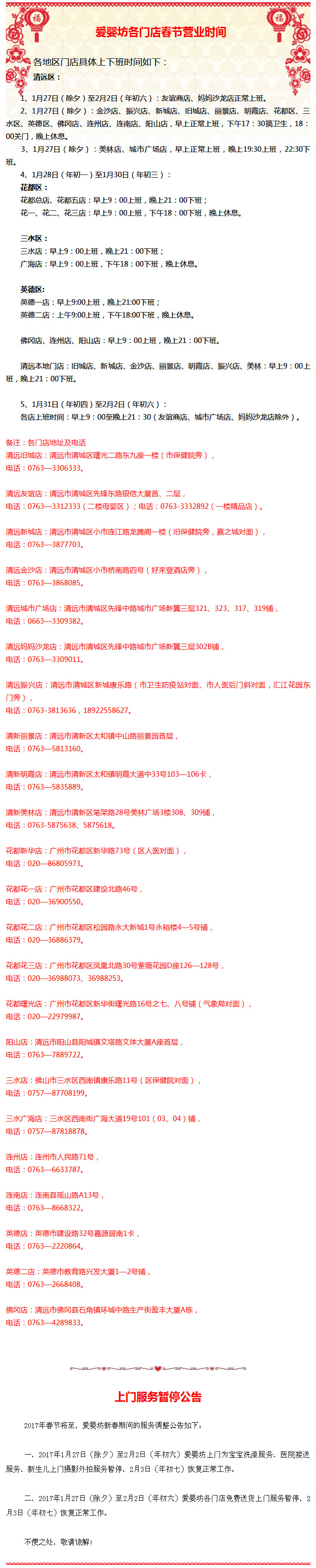 爱婴坊各门店2017年春节期间营业时间调整及上门服务暂停的公告