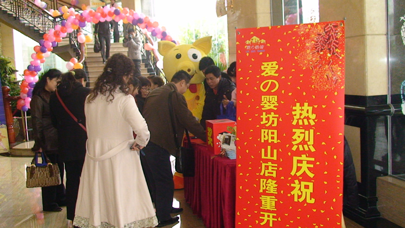 2009年12月29日,位于阳山县阳城镇文塔路文体大厦A座首层,爱の婴坊阳山店盛大开业。阳山店是爱婴坊第十四分店,店里商品齐全、服务周到,还设有宝宝游泳室、宝宝摄影室、宝宝活动室、哺乳区等,是阳山县城最大的购物与娱乐一体的孕婴用品专卖店,让您感受产品优质和亲切服务的全新体验。开业现场我们邀请到小太阳幼儿园的小朋友进行进行精彩的表演。爱婴坊形象代表小宝丁叮一起手舞足蹈,大家欢声笑语,齐聚一堂。在此我们对所有支持我们的客户表示忠心的感谢!